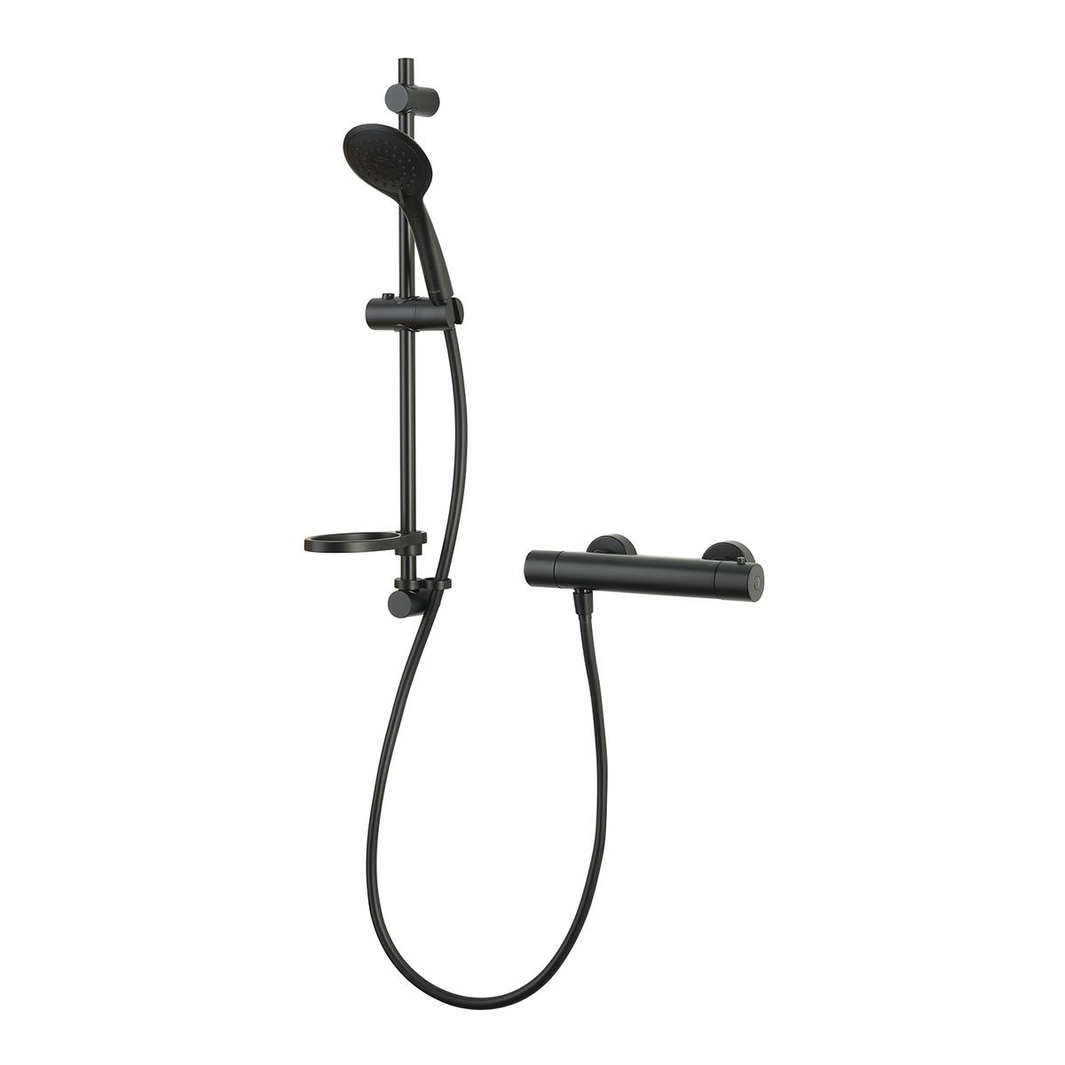This stylish and affordable matt black bar mixer valve is a popular choice of shower for its simple installation, user-friendly operation and reliable temperature contol. The safe touch body, as well as the temperature override button, add assuring safety features, to make it ideal for all round family showering. While the 110mm handset rotates smoothly for 3 alternative spray pattern settings, the efficient internal waterway design consistently delivers an exceptional shower performance from all approved UK plumbing systems. Both valve and shower kit are easily installed with a wall fixing bracket and adjustable rail fixing points. It also comes with a 5 year guarantee as standard (T&C's apply)