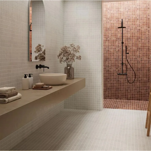 Choosing neutral tiles is a timeless way to create a calming bathroom space that feels both modern and versatile. Soft beige and stone-effect tiles, like the ones shown here, provide a warm backdrop that works with any design style. Neutrals bounce light around the room, making the space feel larger and brighter, while giving you the freedom to change accessories and finishes over time without worrying about clashing colours. Pair with natural textures such as wood shelving or stone basins to complete the serene look.