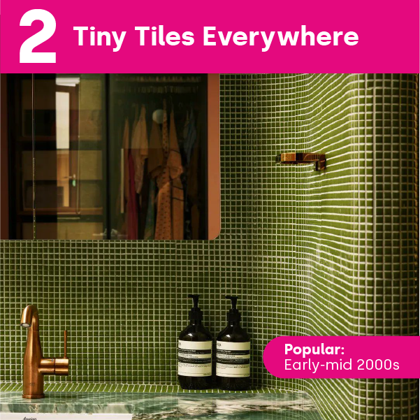 Small-format tiles, mosaics, and miniature squares once covered entire bathrooms, walls, floors, showers, even ceilings. They added texture and detail and were especially popular in the early to mid-2000s.