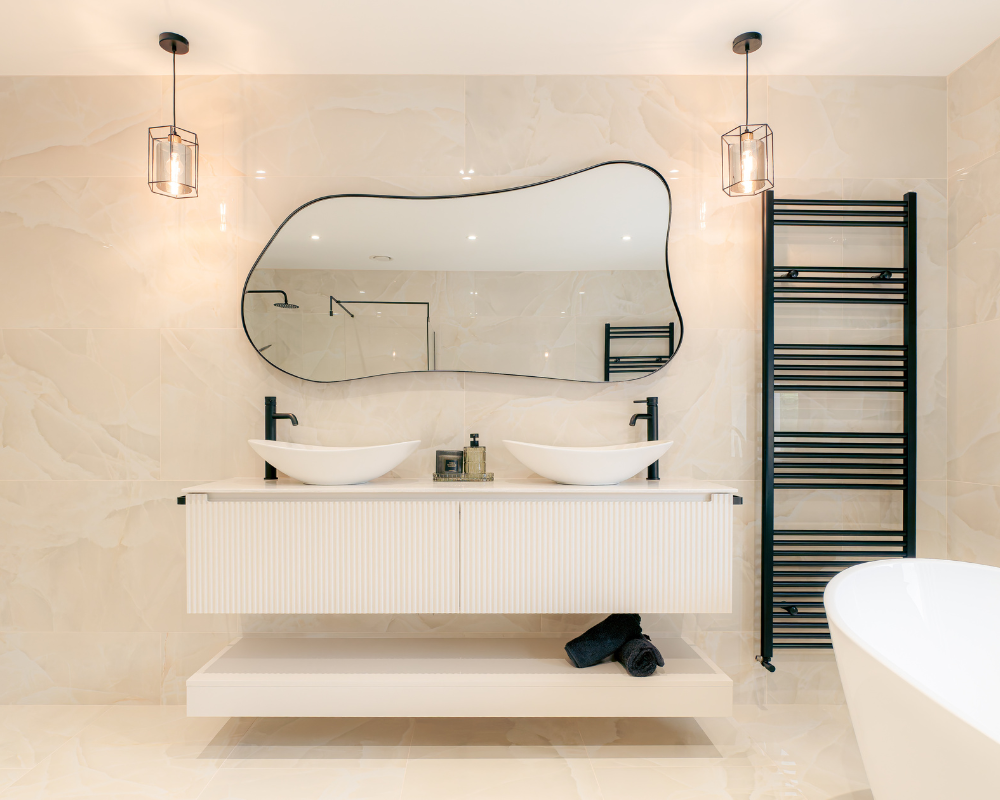 - Add a statement piece - like a fluted vanity or feature tile -to anchor a larger bathroom.