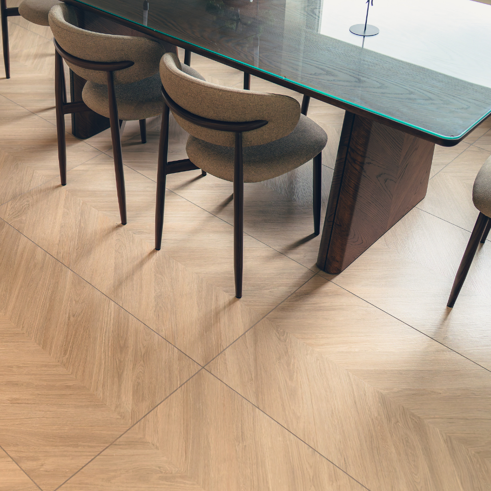 Charlie and Corinna also picked all their tiles and flooring for the rest of the home with bathshack. They went for the Loire Maple Chevron 60 x 120 for the kitchen and throughout the bedrooms.