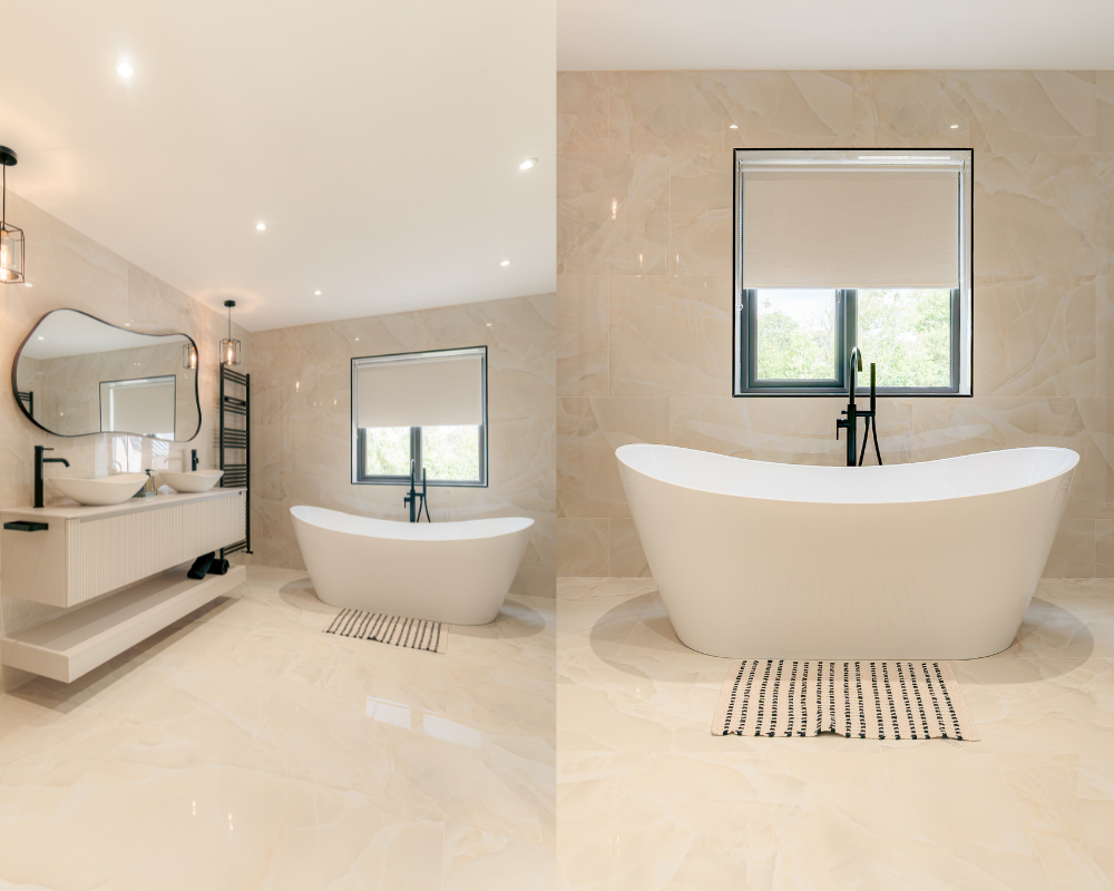 We can’t forget about the Viktor Benson Taha 1800 Freestanding Bath. The room was all tied together by the Onyx Sable 60 x 120cm Polished Rectified tile, which made a huge impact on the overall look of the room. We always suggest starting your bathroom design with the tiles, as many people underestimate how much they can influence the overall look and feel of the space.
