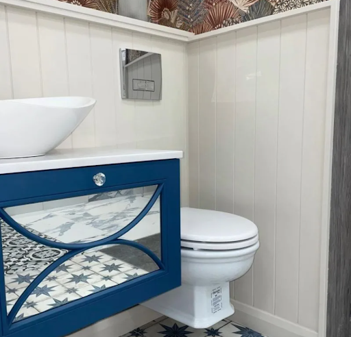 Modern bathrooms focus on clean lines, minimal upkeep, and stylish finishes, and wall panelling checks all these boxes. It’s a sleek alternative to traditional tiles, offering easy cleaning and quicker installation.