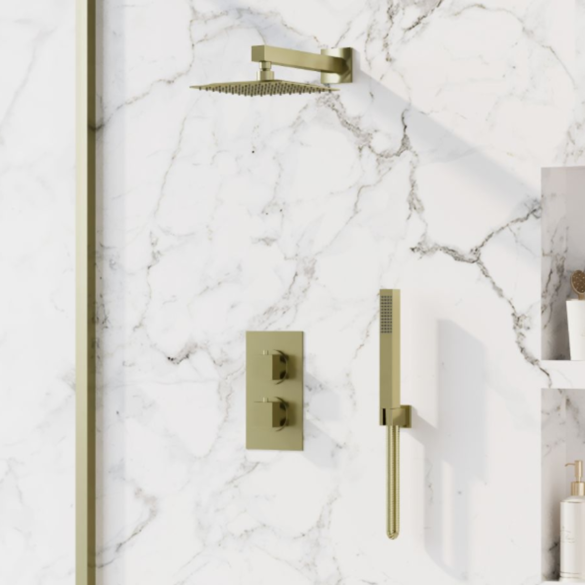 The Eliseo Ricci Cube twin concealed shower kit in Brushed Brass blends clean modern design with safety and precision control. Its concealed brass valve body hides away plumbing, while the thermostatic ceramic disc cartridge maintains stable temperature. The system includes a concealed thermostatic valve, a fixed overhead shower head and a practical handset connected by a 1.5 m hose. Perfect for high-pressure systems, it’s durable, practical, and elegantly streamlined.