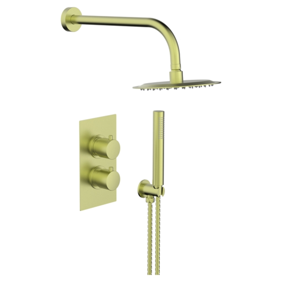 The Eliseo Ricci twin concealed shower kit in brushed brass blends clean modern design with safety and precision control. Its concealed brass valve body hides away plumbing, while the thermostatic ceramic disc cartridge maintains stable temperature. The system includes a concealed thermostatic valve, a fixed overhead shower head and a practical handset connected by a 1.5 m hose. Perfect for high-pressure systems, it’s durable, practical, and elegantly streamlined.