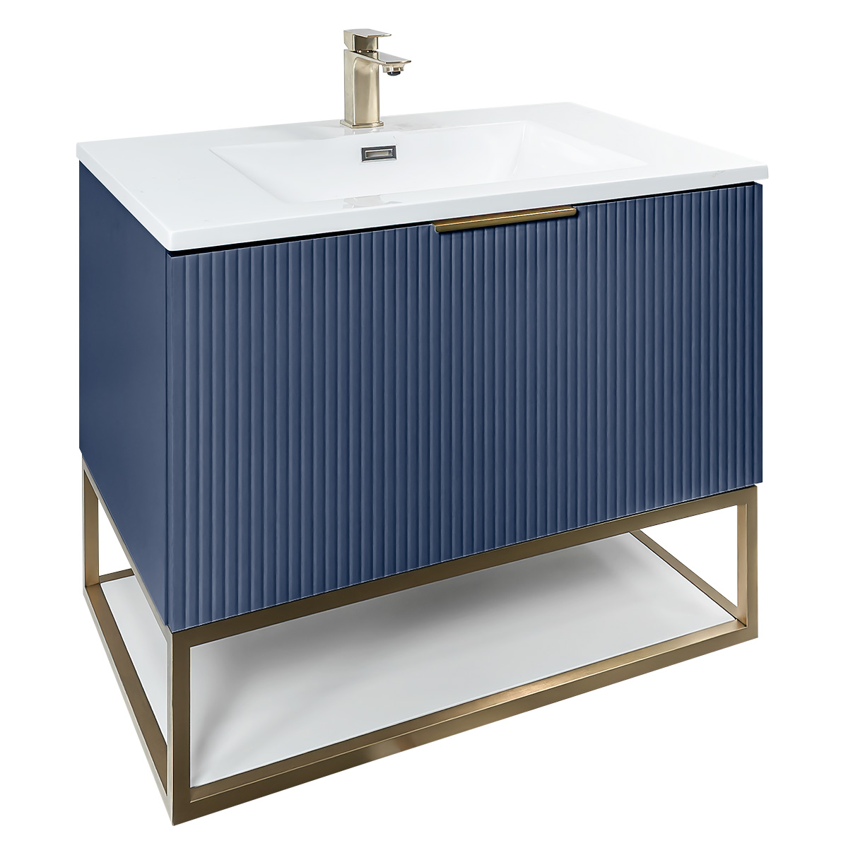 Josef Martin Viso 800mm Wall Mounted Reeded Vanity Unit & Inset Basin with Brushed Brass Frame - Marine Blue