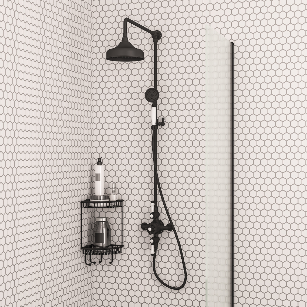 Enhance your bathroom with the Matt Black Traditional Twin Thermostatic Exposed Shower Valve. Combining classic styling with a contemporary matt black finish, this solid brass shower set includes a fixed-height pole, rosehead, handset, and double lock flexi-hose. The thermostatic valve maintains a safe, consistent temperature, with anti-scald and override features for added reassurance. Elegant yet practical, it delivers reliable performance and timeless sophistication for any modern or traditional space.